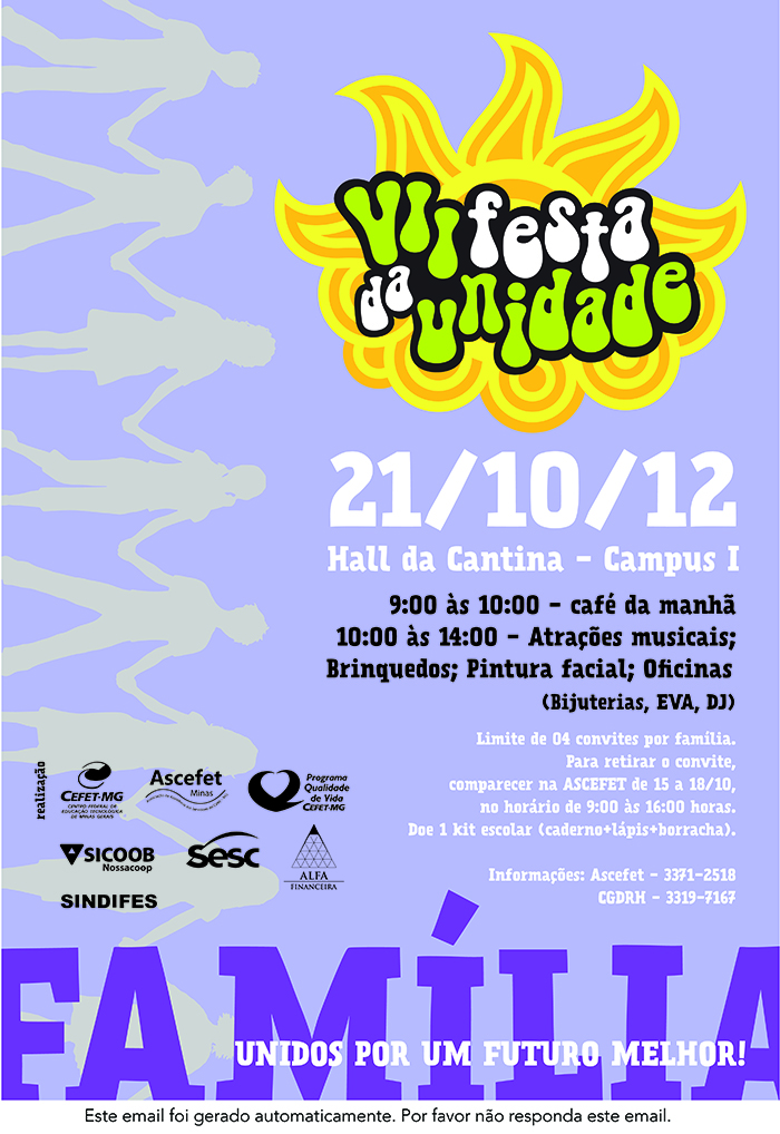 A VII Festa da Unidade será animada pela apresentação de DJs, sob comando do CleverDJ (servidor do CEFET-MG), DJ Sorriso e DJ Guimyts que oferecerão, ainda, uma oficina de Disc Jockey. A cantora Zeila Estrela e sua banda fará o segundo show do dia, com apresentação de sucessos nacionais e internacionais. O evento, promovido pelo CEFET-MG em conjunto com a Ascefetmg e Sindifes, acontece no domingo,
