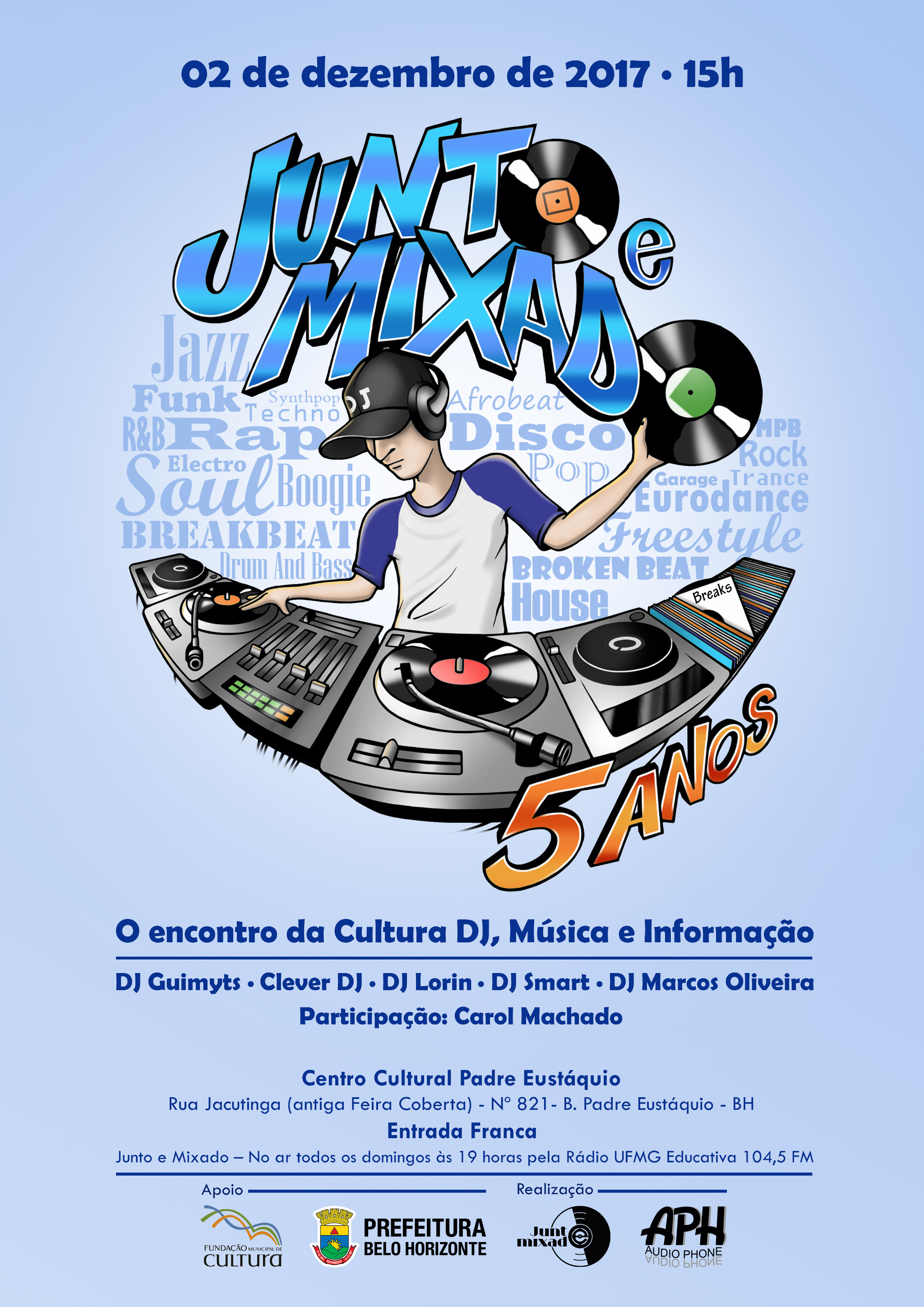 Venha e participe da gravação do programa especial de 5 anos no local e divirta-se com as músicas e mixagens dos DJs que animam suas noites de domingo na Rádio UFMG Educativa 104,5 FM. Entrada Franca.
